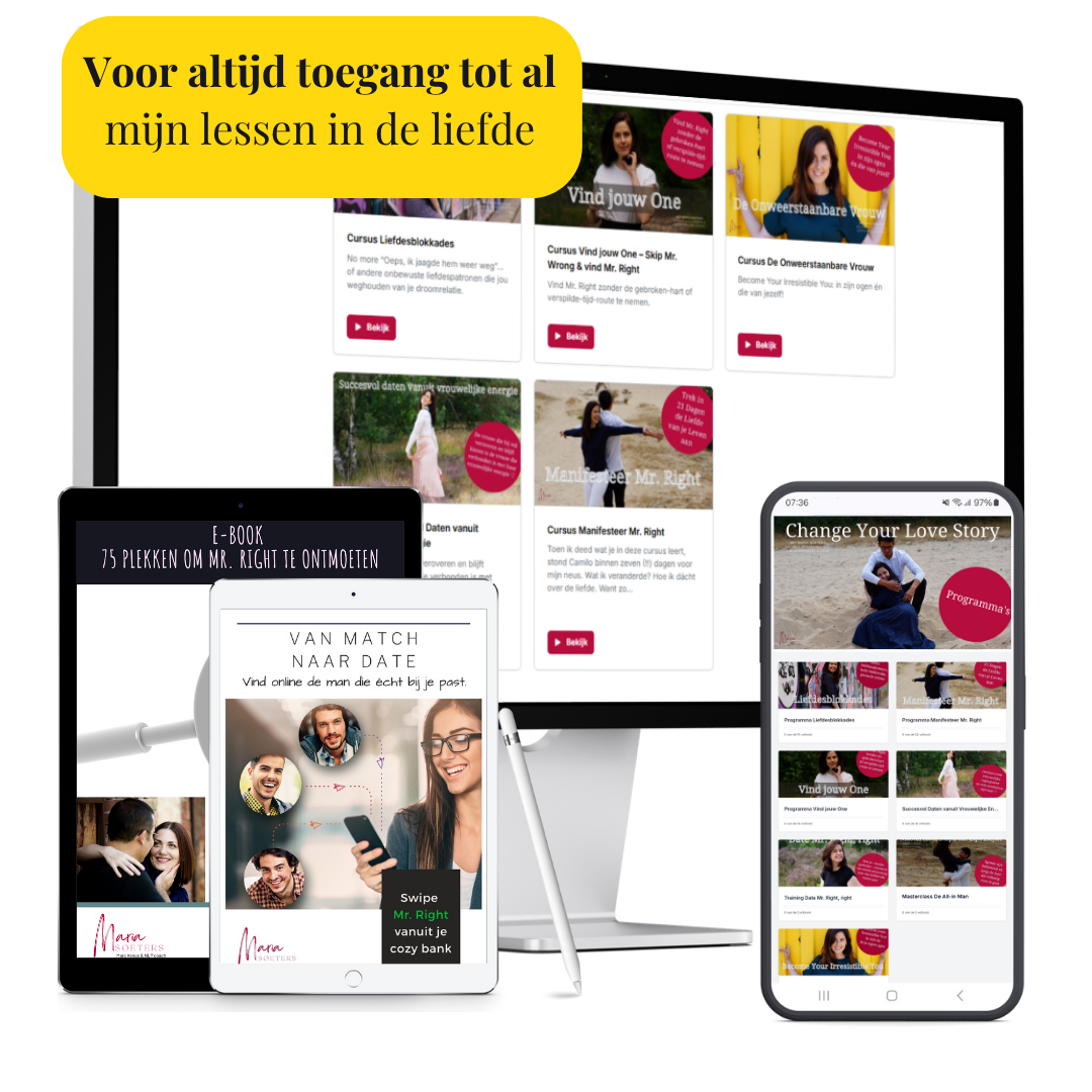 Voor altijd toegang mijn al online liefdeslessen waarin je leert hoe je de juiste man aantrekt en een duurzame, liefdevolle relatie opbouwt.